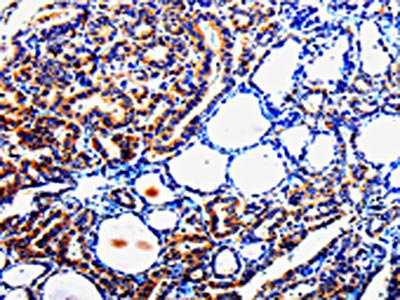 The image is immunohistochemistry of paraffin-embedded Human thyroid cancer tissue using CSB-PA917452(TUBB3 Antibody) at dilution 1/25. (Original magnification: ×200)