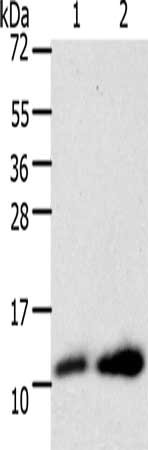 Gel: 12%SDS-PAGE, Lysate: 40 μg, Lane 1-2: A172 cells, hela cells, Primary antibody: CSB-PA281213(TXN Antibody) at dilution 1/200, Secondary antibody: Goat anti rabbit IgG at 1/8000 dilution, Exposure time: 30 minutes