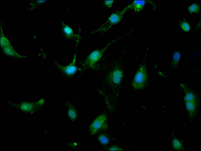 Immunofluorescence staining of U251 cells with CSB-PA812883LA01HU at 1:166, counter-stained with DAPI. The cells were fixed in 4% formaldehyde, permeabilized using 0.2% Triton X-100 and blocked in 10% normal Goat Serum. The cells were then incubated with the antibody overnight at 4°C. The secondary antibody was Alexa Fluor 488-congugated AffiniPure Goat Anti-Rabbit IgG(H+L).