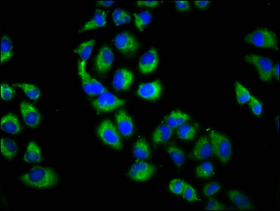 Immunofluorescence staining of Hela cells with CSB-PA757959LA01HU at 1:200, counter-stained with DAPI. The cells were fixed in 4% formaldehyde, permeabilized using 0.2% Triton X-100 and blocked in 10% normal Goat Serum. The cells were then incubated with the antibody overnight at 4°C. The secondary antibody was Alexa Fluor 488-congugated AffiniPure Goat Anti-Rabbit IgG(H+L).
