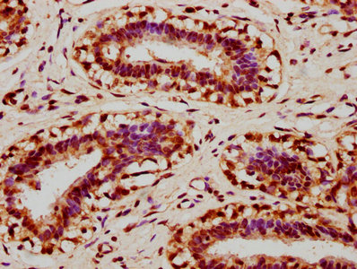 IHC image of CSB-PA012267LA01HU diluted at 1:400 and staining in paraffin-embedded human breast cancer performed on a Leica BondTM system. After dewaxing and hydration, antigen retrieval was mediated by high pressure in a citrate buffer (pH 6.0). Section was blocked with 10% normal goat serum 30min at RT. Then primary antibody (1% BSA) was incubated at 4°C overnight. The primary is detected by a biotinylated secondary antibody and visualized using an HRP conjugated SP system.