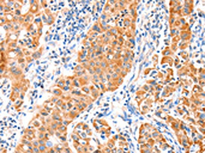 The image on the left is immunohistochemistry of paraffin-embedded Human lung cancer tissue using CSB-PA936526(VANGL1 Antibody) at dilution 1/20, on the right is treated with fusion protein. (Original magnification: ×200)