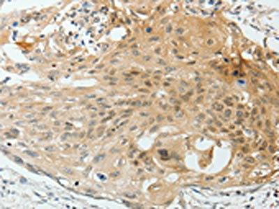 The image on the left is immunohistochemistry of paraffin-embedded Human cervical cancer tissue using CSB-PA379558(VEGFA Antibody) at dilution 1/25, on the right is treated with synthetic peptide. (Original magnification: ×200)