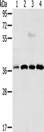 Gel: 12%SDS-PAGE, Lysate: 40 μg, Lane 1-4: Hela cells, Jurkat cells, 293T cells, 231 cells, Primary antibody: CSB-PA379558(VEGFA Antibody) at dilution 1/300, Secondary antibody: Goat anti rabbit IgG at 1/8000 dilution, Exposure time: 50 seconds