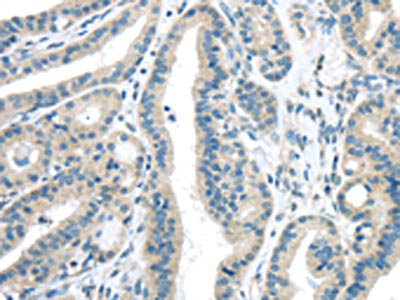 The image on the left is immunohistochemistry of paraffin-embedded Human thyroid cancer tissue using CSB-PA279988(VLDLR Antibody) at dilution 1/35, on the right is treated with synthetic peptide. (Original magnification: ×200)