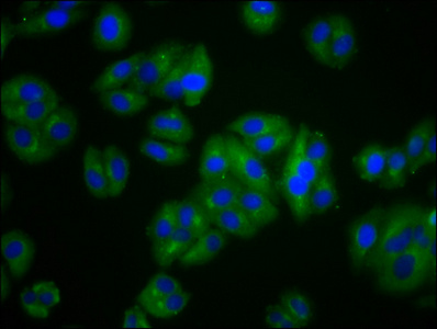 Immunofluorescence staining of HepG2 cells with CSB-PA025865LA01HU at 1:100, counter-stained with DAPI. The cells were fixed in 4% formaldehyde, permeabilized using 0.2% Triton X-100 and blocked in 10% normal Goat Serum. The cells were then incubated with the antibody overnight at 4°C. The secondary antibody was Alexa Fluor 488-congugated AffiniPure Goat Anti-Rabbit IgG(H+L).