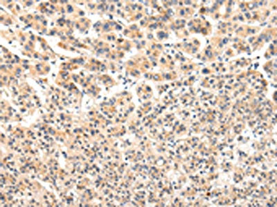 The image on the left is immunohistochemistry of paraffin-embedded Human liver cancer tissue using CSB-PA128038(VPS33A Antibody) at dilution 1/30, on the right is treated with fusion protein. (Original magnification: ×200)