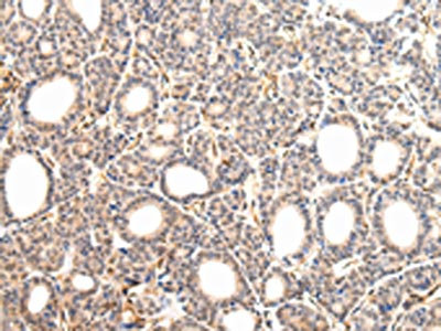 The image on the left is immunohistochemistry of paraffin-embedded Human thyroid cancer tissue using CSB-PA128038(VPS33A Antibody) at dilution 1/30, on the right is treated with fusion protein. (Original magnification: ×200)