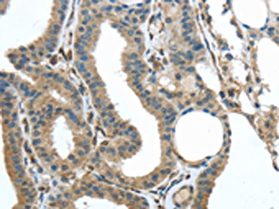 The image on the left is immunohistochemistry of paraffin-embedded Human thyroid cancer tissue using CSB-PA122476(VSIG10 Antibody) at dilution 1/35, on the right is treated with synthetic peptide. (Original magnification: ×200)