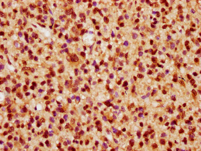 IHC image of CSB-PA861995LA01HU diluted at 1:300 and staining in paraffin-embedded human glioma performed on a Leica BondTM system. After dewaxing and hydration, antigen retrieval was mediated by high pressure in a citrate buffer (pH 6.0). Section was blocked with 10% normal goat serum 30min at RT. Then primary antibody (1% BSA) was incubated at 4°C overnight. The primary is detected by a biotinylated secondary antibody and visualized using an HRP conjugated SP system.