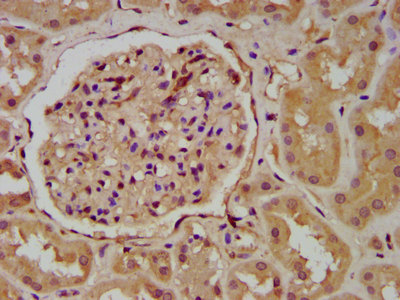 IHC image of CSB-PA026146LA01HU diluted at 1:200 and staining in paraffin-embedded human kidney tissue performed on a Leica BondTM system. After dewaxing and hydration, antigen retrieval was mediated by high pressure in a citrate buffer (pH 6.0). Section was blocked with 10% normal goat serum 30min at RT. Then primary antibody (1% BSA) was incubated at 4°C overnight. The primary is detected by a biotinylated secondary antibody and visualized using an HRP conjugated SP system.