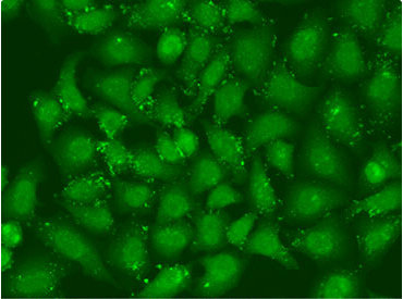 Immunofluorescent analysis of U2OS cells using CSB-PA026183KA01HU at dilution of 1:100 and Alexa Fluor 488-congugated AffiniPure Goat Anti-Rabbit IgG(H+L).