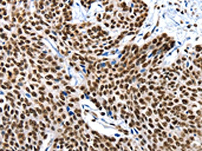 The image on the left is immunohistochemistry of paraffin-embedded Human esophagus cancer tissue using CSB-PA575804(XRCC6 Antibody) at dilution 1/10, on the right is treated with fusion protein. (Original magnification: ×200)