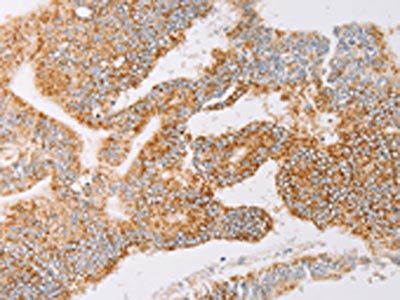 The image on the left is immunohistochemistry of paraffin-embedded Human lung cancer tissue using CSB-PA258399(YARS2 Antibody) at dilution 1/30, on the right is treated with fusion protein. (Original magnification: ×200)