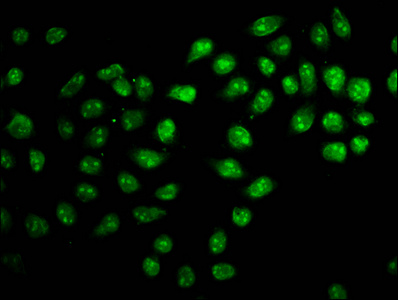 Immunofluorescence staining of Hela cells with CSB-PA026592LA01HU at 1:166, counter-stained with DAPI. The cells were fixed in 4% formaldehyde, permeabilized using 0.2% Triton X-100 and blocked in 10% normal Goat Serum. The cells were then incubated with the antibody overnight at 4°C. The secondary antibody was Alexa Fluor 488-congugated AffiniPure Goat Anti-Rabbit IgG(H+L).