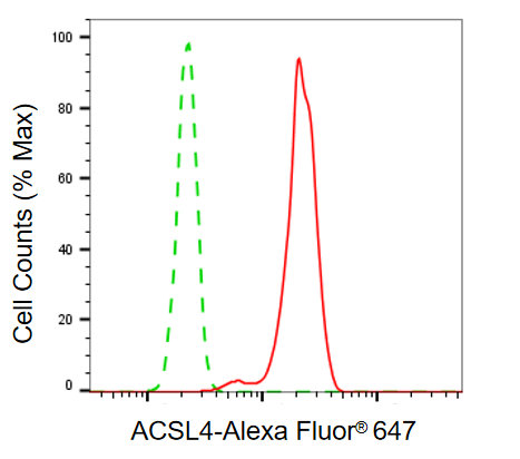 Flow cytometric analysis of ACSL4 expression in HT-1080 cells using ACSL4 antibody. Green, isotype control; red, ACSL4.