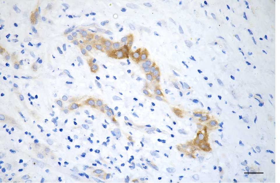 Immunohistochemistry was performed on paraffin-embedded human hepatocarcinoma using ACSL4 antibody. Antigen retrieval was done in sodium citrate buffer (pH 6.0). DAB was used for detection, with hematoxylin counterstaining. Images were acquired using a Nikon Ci-L Plus microscope (40× objective). Scale bar: 25 μm.