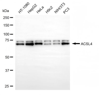 Western blotting analysis using ACSL4 antibody. Total cell lysates (30 μg) from various cell lines were loaded and separated by SDS-PAGE. The blot was incubated with ACSL4 antibody and HRP-conjugated goat anti-rabbit secondary antibody respectively.