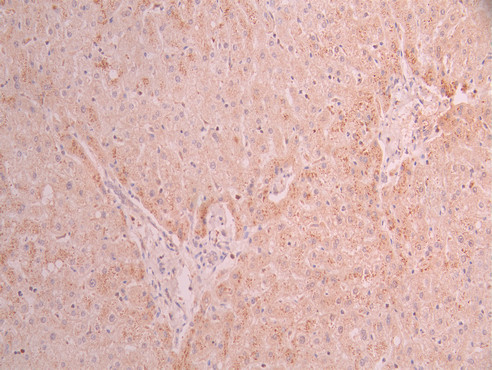IHC image of CSB-RA562580A0HU diluted at 1:100 and staining in paraffin-embedded human liver tissue performed on a Leica BondTM system. After dewaxing and hydration, antigen retrieval was mediated by high pressure in a citrate buffer (pH 6.0). Section was blocked with 10% normal goat serum 30min at RT. Then primary antibody (1% BSA) was incubated at 4°C overnight. The primary is detected by a Goat anti-rabbit polymer IgG labeled by HRP and visualized using 0.05% DAB.