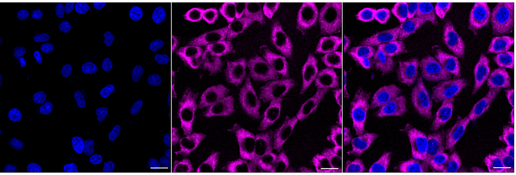 Immunocytochemical staining of HepG2 cells with ALKBH2 antibody. Nuclei were stained blue with DAPI; ALKBH2 was stained magenta with Alexa Fluor? 647. Images were taken using Leica stellaris 5. Protein abundance based on laser Intensity and smart gain: Medium. Scale bar, 20 μm.