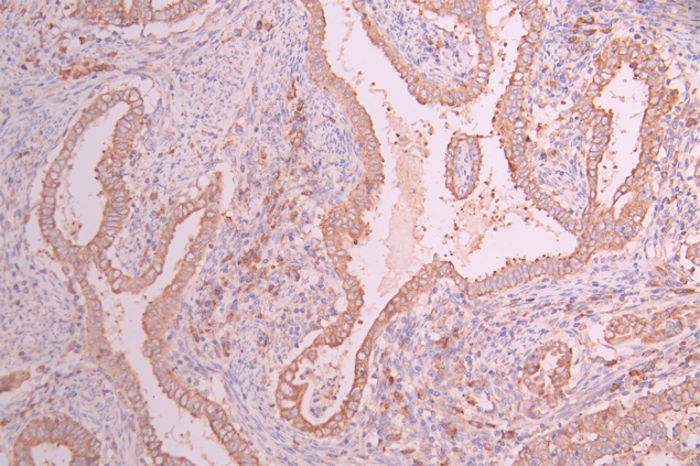 IHC image of CSB-RA998339A0HU diluted at 1:100 and staining in paraffin-embedded human endometrial cancer/endometrial carcinoma performed on a Leica BondTM system. After dewaxing and hydration, antigen retrieval was mediated by high pressure in a citrate buffer (pH 6.0). Section was blocked with 10% normal goat serum 30min at RT. Then primary antibody (1% BSA) was incubated at 4°C overnight. The primary is detected by a Goat anti-rabbit polymer IgG labeled by HRP and visualized using 0.05% DAB.