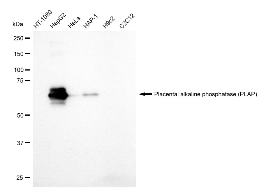 Western blotting analysis using Placental alkaline phosphatase (PLAP) antibody. Total cell lysates (30 μg) from various cell lines were loaded and separated by SDS-PAGE. The blot was incubated with Placental alkaline phosphatase (PLAP) antibody and HRP-conjugated goat anti-rabbit secondary antibody respectively.