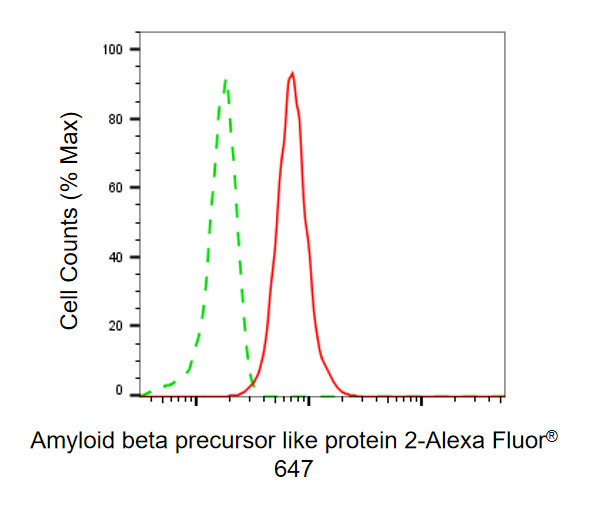 Flow cytometric analysis of Amyloid beta precursor like protein 2 expression in HepG2 cells using Amyloid beta precursor like protein 2 antibody. Green, isotype control; red, Amyloid beta precursor like protein 2.