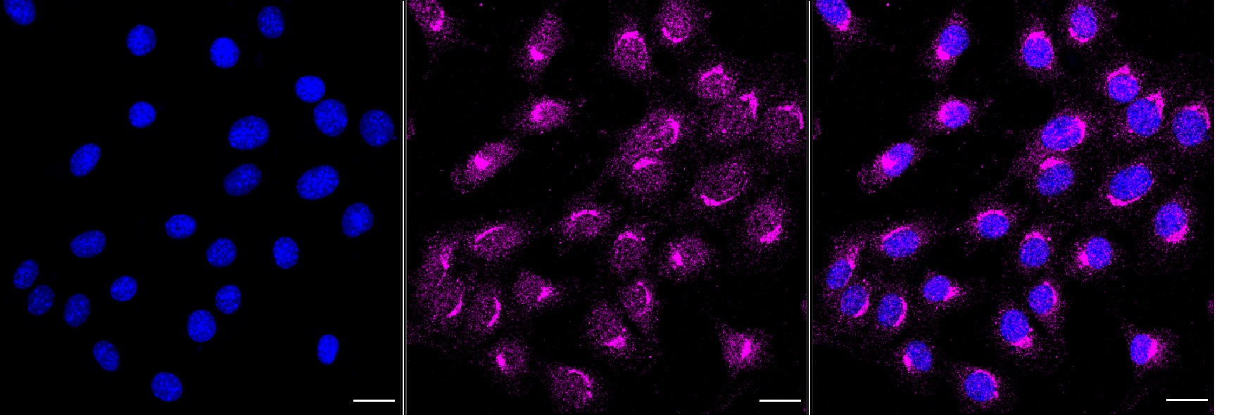 Immunocytochemical staining of C2C12 cells with ADP ribosylation factor 1?antibody. Nuclei were stained blue with DAPI; ADP ribosylation factor 1 was stained magenta with Alexa Fluor? 647. Images were taken using Leica stellaris 5. Protein abundance based on laser Intensity and smart gain: Medium. Scale bar, 20 μm.