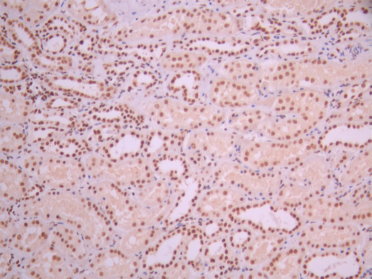 IHC image of CSB-RA164774A0HU diluted at 1:100 and staining in paraffin-embedded human kidney tissue performed on a Leica BondTM system. After dewaxing and hydration, antigen retrieval was mediated by high pressure in a citrate buffer (pH 6.0). Section was blocked with 10% normal goat serum 30min at RT. Then primary antibody (1% BSA) was incubated at 4°C overnight. The primary is detected by a Goat anti-rabbit polymer IgG labeled by HRP and visualized using 0.05% DAB.