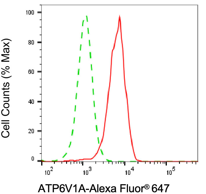 Flow cytometric analysis of ATP6V1A expression in HepG2 cells using ATP6V1A antibody. Green, isotype control; red, ATP6V1A.
