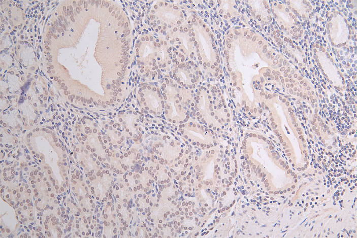 IHC image of CSB-RA547773A0HU diluted at 1:100 and staining in paraffin-embedded human gastric cancer performed on a Leica BondTM system. After dewaxing and hydration, antigen retrieval was mediated by high pressure in a citrate buffer (pH 6.0). Section was blocked with 10% normal goat serum 30min at RT. Then primary antibody (1% BSA) was incubated at 4°C overnight. The primary is detected by a Goat anti-rabbit polymer IgG labeled by HRP and visualized using 0.07% DAB.