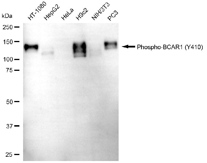 Western blotting analysis using phospho-BCAR1 (Y410) antibody. Total cell lysates (30 μg) from various cell lines were loaded and separated by SDS-PAGE. The blot was incubated with phospho-BCAR1 (Y410) antibody and HRP-conjugated goat anti-rabbit secondary antibody respectively.
