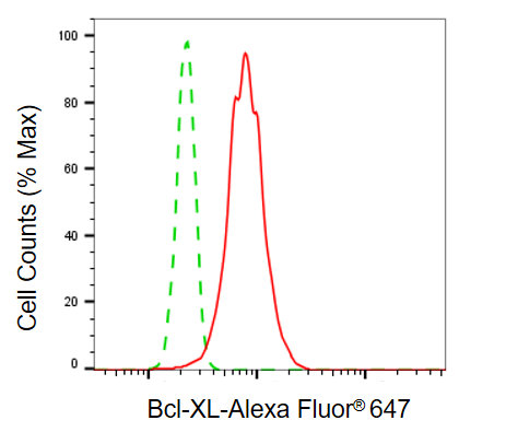 Flow cytometric analysis of Bcl-XL expression in HT-1080 cells using Bcl-XL antibody. Green, isotype control; red, Bcl-XL.