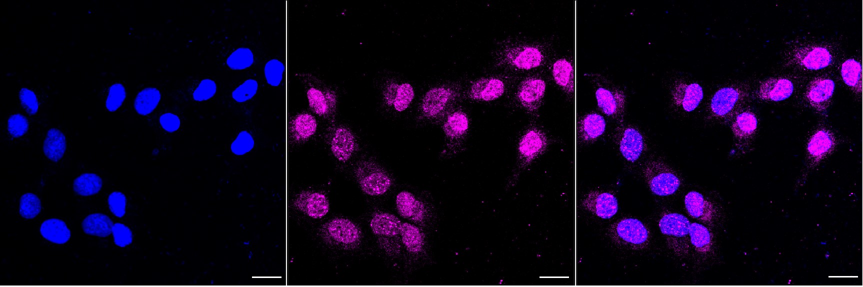 Immunocytochemical staining of HT-1080 cells with Bcl-XL antibody. Nuclei were stained blue with DAPI; Bcl-XL was stained magenta with Alexa Fluor? 647. Images were taken using Leica stellaris 5. Protein abundance based on laser Intensity and smart gain: Low. Scale bar, 20 μm.