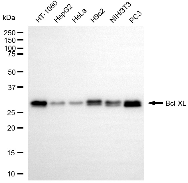 Western blotting analysis using Bcl-XL antibody. Total cell lysates (30 μg) from various cell lines were loaded and separated by SDS-PAGE. The blot was incubated with Bcl-XL antibody and HRP-conjugated goat anti-rabbit secondary antibody respectively.
