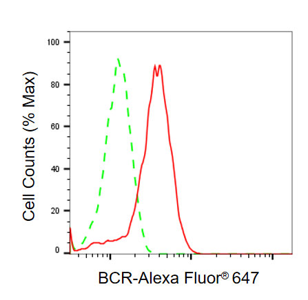 Flow cytometric analysis of BCR expression in HepG2 cells using BCR antibody. Green, isotype control; red, BCR.