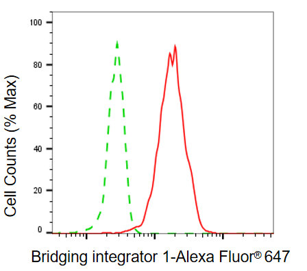 Flow cytometric analysis of bridging integrator 1 expression in HepG2 cells using bridging integrator 1 antibody. Green, isotype control; red, bridging integrator 1.
