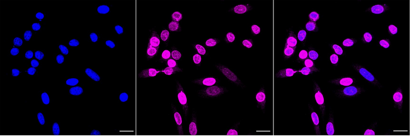 Immunocytochemical staining of HepG2 cells with Bridging integrator 1 antibody. Nuclei were stained blue with DAPI; Bridging integrator 1 was stained magenta with Alexa Fluor? 647. Images were taken using Leica stellaris 5. Protein abundance based on laser Intensity and smart gain: Medium. Scale bar, 20 μm.