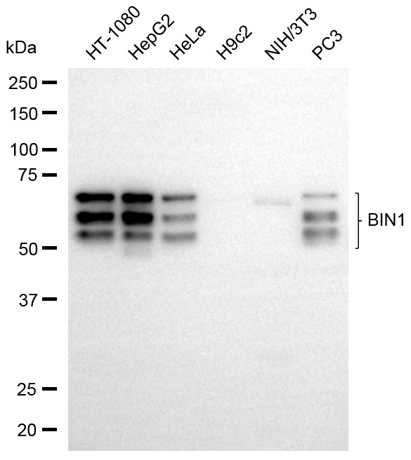 Western blotting analysis using bridging integrator 1 antibody. Total cell lysates (30 μg) from various cell lines were loaded and separated by SDS-PAGE. The blot was incubated with bridging integrator 1 antibody and HRP-conjugated goat anti-rabbit secondary antibody respectively.
