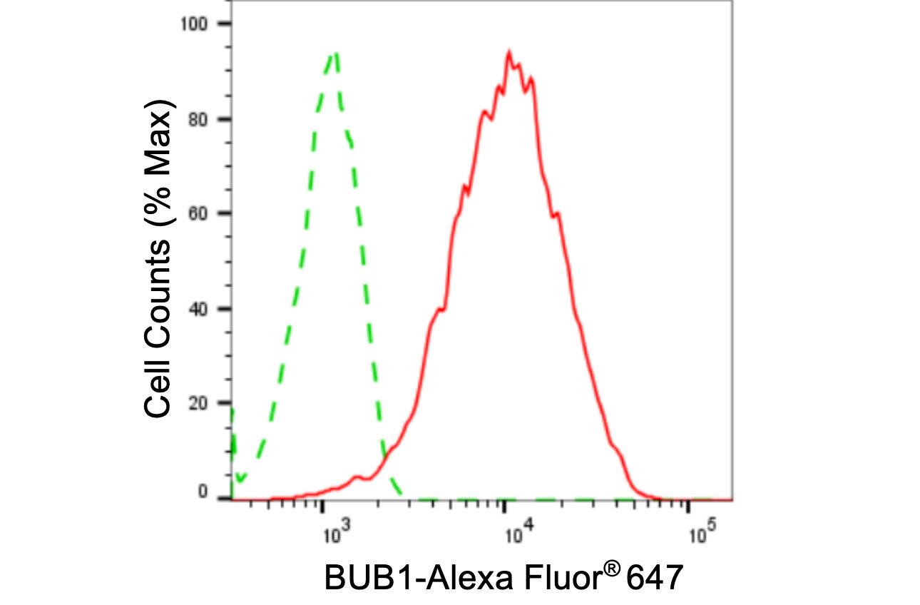 Flow cytometric analysis of BUB1 expression in HAP-1 cells using BUB1 antibody. Green, isotype control; red, BUB1.