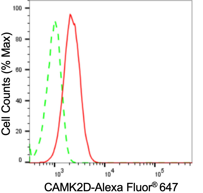 Flow cytometric analysis of CAMK2D expression in C2C12 cells using CAMK2D antibody. Green, isotype control; red, CAMK2D.