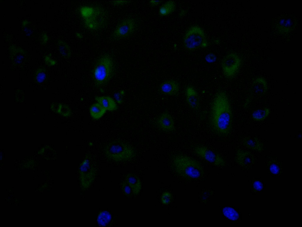 Immunofluorescence staining of A549 cell with CSB-RA947028A0HU at 1:50, counter-stained with DAPI. The cells were fixed in 4% formaldehyde and blocked in 10% normal Goat Serum. The cells were then incubated with the antibody overnight at 4°C. The secondary antibody was Alexa Fluor 488-congugated AffiniPure Goat Anti-Rabbit IgG(H+L).