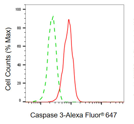 Flow cytometric analysis of Caspase 3 p12 expression in C2C12 cells using Caspase 3 p12 antibody. Green, isotype control; red, Caspase 3 p12.