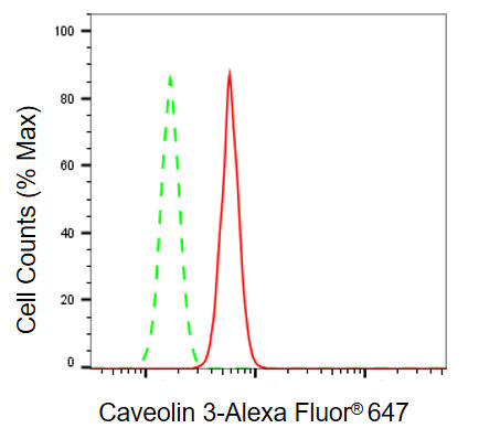 Flow cytometric analysis of caveolin 3 expression in H9C2 cells using caveolin 3 antibody. Green, isotype control; red, caveolin 3.
