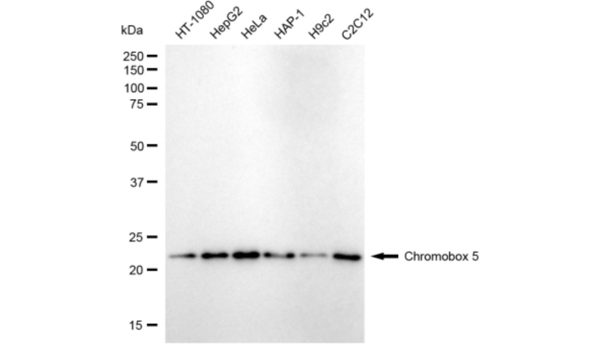 Western blotting analysis using Chromobox 5 antibody. Total cell lysates (30 μg) from various cell lines were loaded and separated by SDS-PAGE. The blot was incubated with Chromobox 5 antibody and HRP-conjugated goat anti-rabbit secondary antibody respectively.