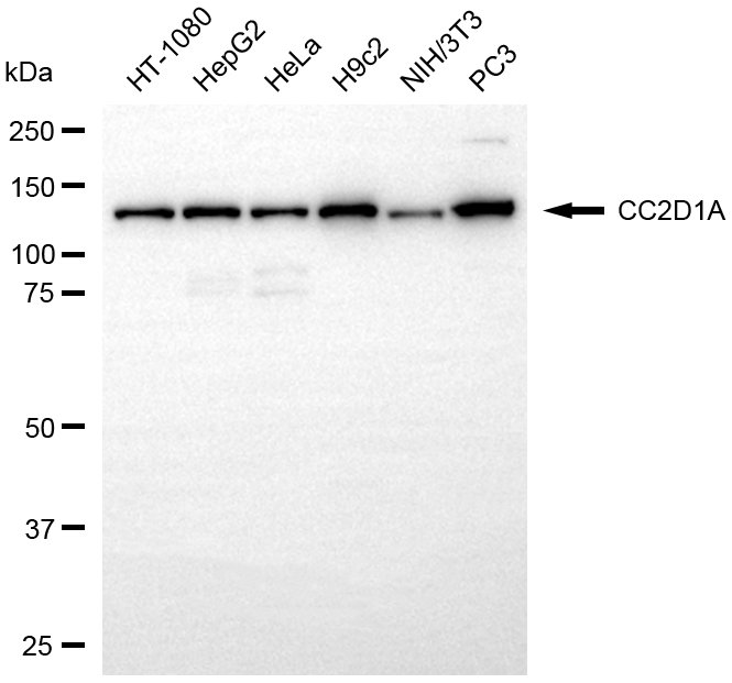 Western blotting analysis using CC2D1A antibody. Total cell lysates (20 μg) from various cell lines were loaded and separated by SDS-PAGE. The blot was incubated with CC2D1A antibody and HRP-conjugated goat anti-rabbit secondary antibody respectively.