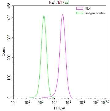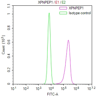 Overlay Peak curve showing JK cells surface stained with CSB-RA004931MA1HU (red line) at 1:100. Then 10% normal goat serum was Incubated to block non-specific protein-protein interactions followed by the antibody (1μg/1*106cells) for 45 min at 4°C. The secondary antibody used was FITC-conjugated Goat Anti-Mouse IgG(H+L) at 1/200 dilution for 35 min at 4°C. Isotype control antibody (green line) was mouse IgG1 (1μg/1*106cells) used under the same conditions. Acquisition of >10, 006 events was performed.