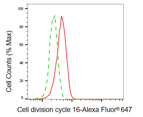 Flow cytometric analysis of cell division cycle 16 expression in C2C12 cells using cell division cycle 16 antibody. Green, isotype control; red, cell division cycle 16.