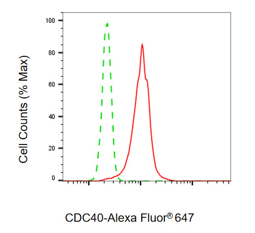 Flow cytometric analysis of CDC40 expression in HT-1080 cells using CDC40 antibody. Green, isotype control; red, CDC40.