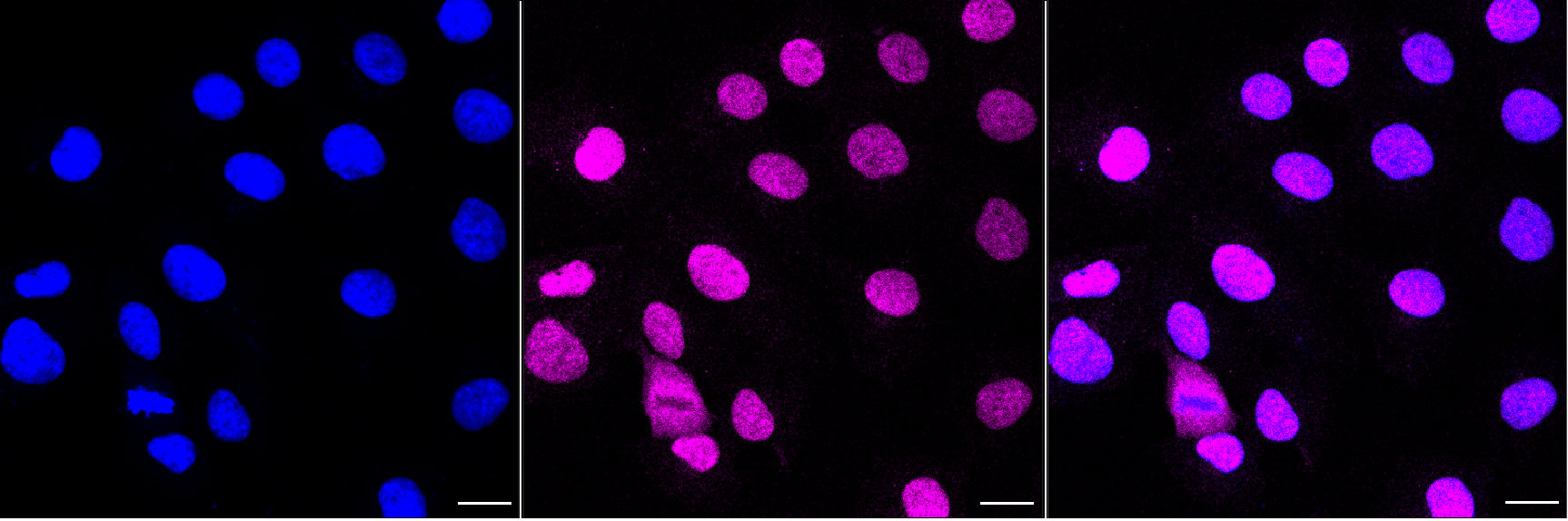 Immunocytochemical staining of HT-1080 cells with CDC40 antibody. Nuclei were stained blue with DAPI; CDC40 was stained magenta with Alexa Fluor? 647. Scale bar, 20 μm.